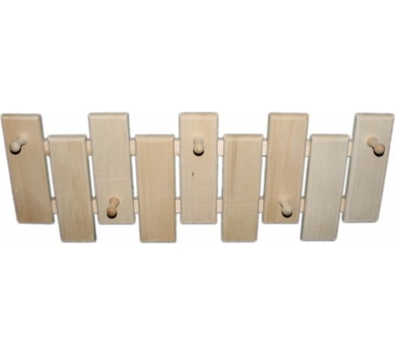 Вешалка на 5 креплений изготовлена из липы, отличается высоким качеством материала и добротным исполнением. На пяти креплениях можно размещать банные аксессуары и одежду.