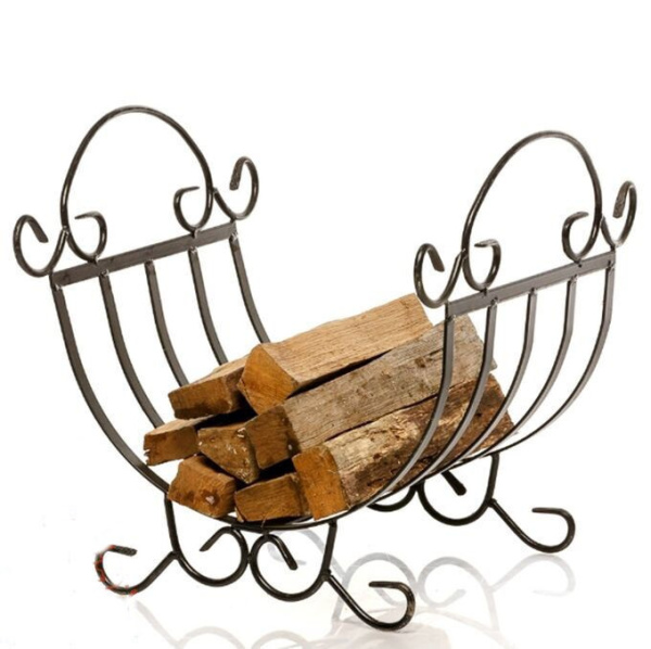 Для хранения небольшого количества дров возле камина используют специальные дровницы. Кроме практичных свойств, кованые изделия обладают шикарным дизайном и украшают помещение, в котором находятся.