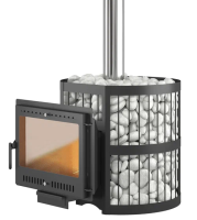 Чугунная печь для бани на дровах ЭТНА 24 (Панорама) "М" Закрытая каменка, Стандарт со стеклом, с топочным выносом, с открытой камнкой сеткой СТАНДАРТ на 150 кг камней, и закрытой каменкой на 80 кг камней, обогревает парное помещение бани от 12 до 24 м3.