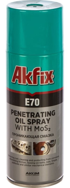 Проникающая смазка Akfix E70 содержит в своем составе сульфат молибдена. Этот компонент увеличивает качество работы подвижных деталей и существенно снижает трение.