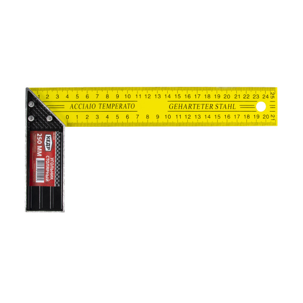 Столярный угольник состоит из двух основных элементов – рукояти и измерительной линейки. Использует метрическая систему, деления нанесены по трем сторонам. Линейка изготовлена из инструментальной стали, а ручка-основание из алюминиевого сплава.