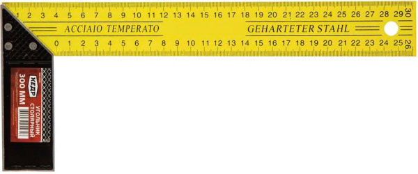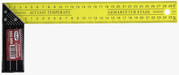 Столярный угольник состоит из двух основных элементов – рукояти и измерительной линейки. Использует метрическая систему, деления нанесены по трем сторонам. Линейка изготовлена из инструментальной стали, а ручка-основание из алюминиевого сплава.