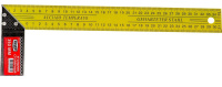 Столярный угольник состоит из двух основных элементов – рукояти и измерительной линейки. Использует метрическая систему, деления нанесены по трем сторонам. Линейка изготовлена из инструментальной стали, а ручка-основание из алюминиевого сплава.