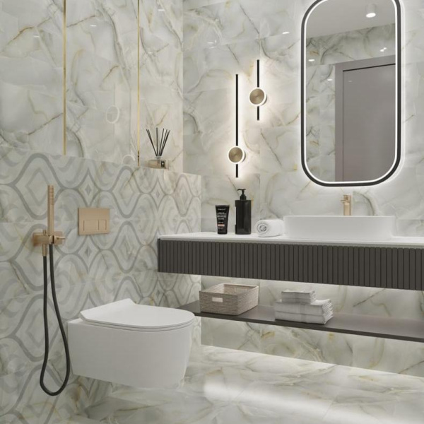 Коллекция Меоланс Primavera выполнена в классическом стиле. Представлена актуальной текстурой яркого оникса, и дополнена плиткой с классическим узором.