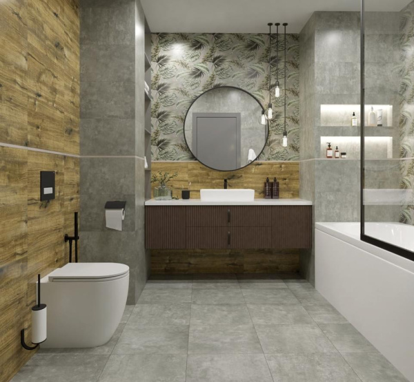 Коллекция Палинур Primavera выполнена в современном стиле лофт. Представлена актуальной текстурой бетона и дерева, дополнена плиткой с растительным рисунком.