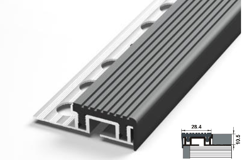 Внешний угол (накладка на ступень ) с ПВХ накладкой против скольжения и как эелемент грязезащиты. Предназначен для защиты граней ступени. Способ монтажа: устанавливается до момента укладки напольного покрытия на ступень, так как невидимая алюминиевая основа закладывается под напольное покрытие.