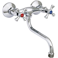 Силуминовый вентильный (кран-буксовый) смеситель для кухни от стены с поворотным носом. Смеситель предназначен для встроенного монтажа на два отверстия, крепление на эксцентриках. Принцип смешивания воды —двухручковый.