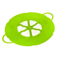 Крышка-невыкипайка диаметром 26см из силикона в форме вогнутого цветка со съемной серединкой и подвижными лепестками, которые во время кипения жидкости в кастрюле приподнимаются, выпуская лишний пар и не давая выплескиваться жидкости.