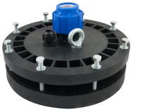 Скважинный оголовок выполнен из пластмассы и состоит из крышки, прижимного фланца и резинового кольца. В крышке оголовка установлены два верхних стальных рым-болта, к которым присоединяют различные грузоподъемные механизмы при погружении насоса. Нижний стальной рым-болт с колпачковой контргайкой имеет подвешенный карабин для крепления троса.